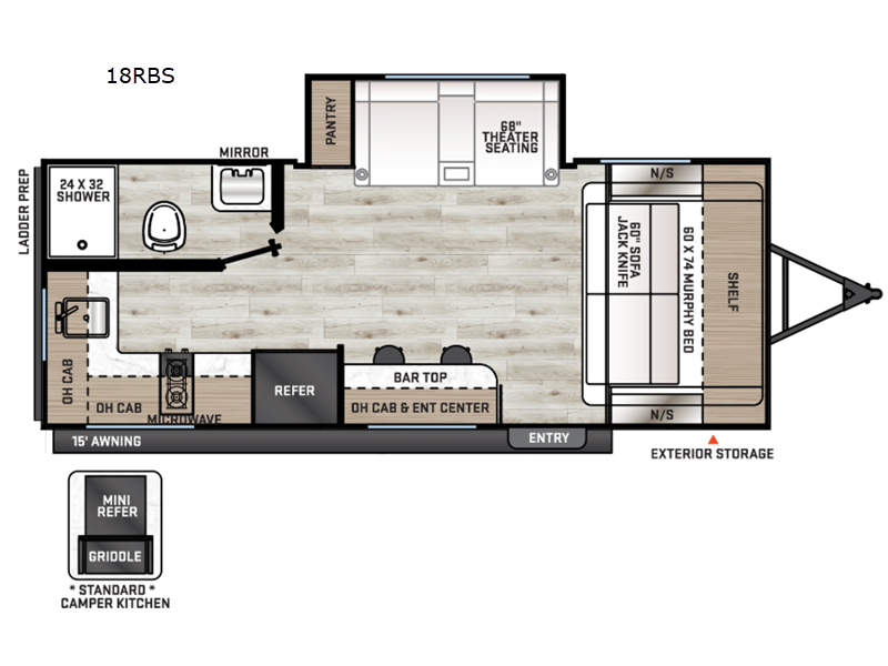 Sleeps 2 Slides 1 Length 23 ft 6 in Ext Width 7 ft 6 in Ext Height 10 ft 1 in Int Height 6 ft 6 in Hitch Weight 590 lbs GVWR 6200 lbs Dry Weight 4605 lbs Cargo Capacity 1595 lbs Fresh Water Capacity 44 gals Grey Water Capacity 30 gals Black Water Capacity 30 gals Available Beds Murphy Refrigerator Type Stainless Steel GE 12V Refrigerator Size 10.7 cu ft Shower Size 24" x 32" Number of Awnings 1 LP Tank Capacity 20 lbs Water Heater Type Tankless AC BTU 13500 btu Awning Info 15' Electric w/Multicolor Lights and Remote Axle Count 1 Number of LP Tanks 1 Shower Type Standard Similar Travel Trailer Floorplans