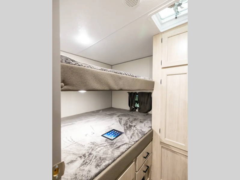 Sleeps 10 Slides 1 Length 33 ft 4 in Ext Width 8 ft Ext Height 11 ft 3 in Int Height 6 ft 9 in Hitch Weight 876 lbs GVWR 9186 lbs Dry Weight 7186 lbs Cargo Capacity 2000 lbs Fresh Water Capacity 38 gals Grey Water Capacity 74 gals Black Water Capacity 29 gals Furnace BTU 35000 btu Number Of Bunks 2 Available Beds RV Queen Refrigerator Type Stainless Steel GE 12V Refrigerator Size 10.7 cu ft Cooktop Burners 3 Number of Awnings 1 LP Tank Capacity 20 lbs Water Heater Type Tankless AC BTU 15000 btu Awning Info 21' Electric w/Multicolor Lights and Remote Axle Count 2 Number of LP Tanks 2 Shower Type Tub/Shower Combo Similar Floorplans