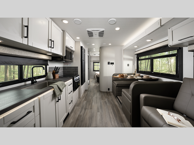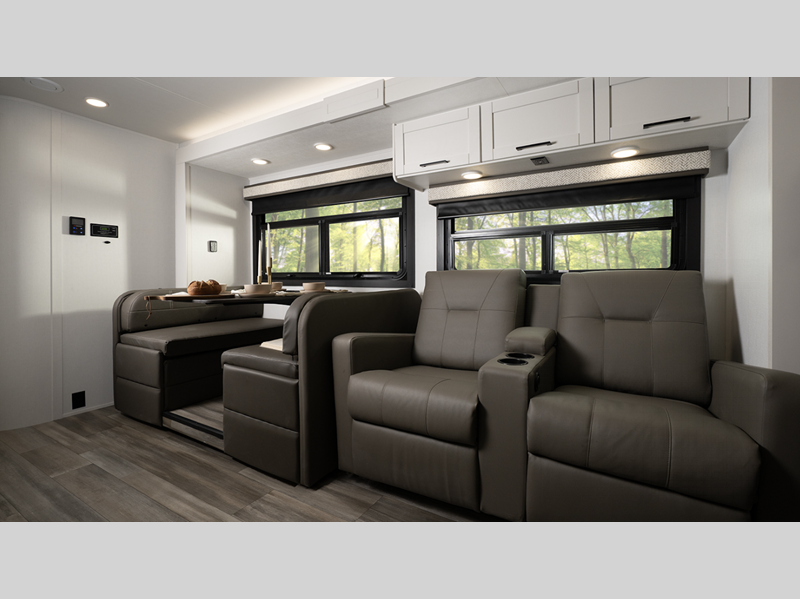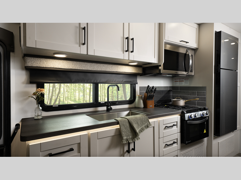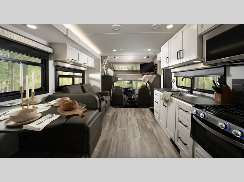 Each model includes a new Winegard 2.0 Wi-Fi/4G antenna and an LED HD Smart TV in the living room to wash away those rainy day blues. The full-body paint options are sure to turn heads, and you'll love the panoramic window with a shade in the front cap. The interior will have you feeling right at home with LED-lit hardwood fascia, hardwood cabinet doors, frameless windows, and decorative kitchen backsplash.