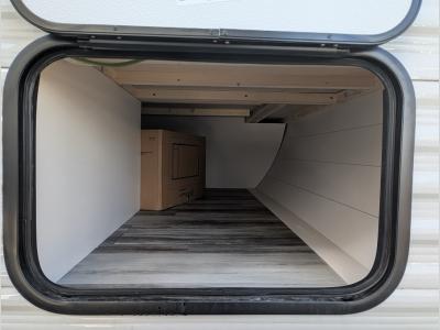Inside, you’ll find an efficient layout with a practical kitchenette, overhead storage, and bright, modern décor that makes the space feel open and inviting. Its compact size makes it perfect for quick weekend getaways, spontaneous road trips, or exploring smaller campgrounds where maneuverability is key.