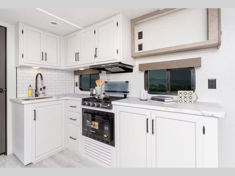 Each model features an 8' wide construction, an AlphaPly TPO roof membrane, and a flat front metal with tough coat for added protection. You will also appreciate the pass-through storage compartment outside, along with a power tongue jack and power awning with LED lights. Inside, there is LED lighting throughout, blackout night shades, seamless pressed membrane countertops and many more comforts.