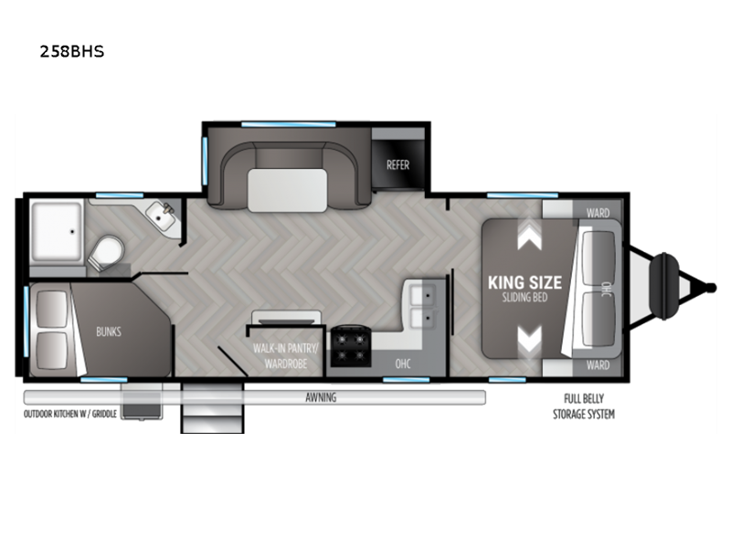 Pack your bags and head to the campground with this travel trailer! There are plenty of sleeping spaces between the set of bunk beds, the patent pending king bed slide system with a pet palace underneath, and even the U-shaped dinette once converted. The walk-in pantry/wardrobe can hold your snacks and your coats. Prepare your best meals either indoors with the four burner cooktop or head to the outside kitchen with a griddle to breathe in some fresh air while you cook. Everyone will stay clean with the rear corner bathroom and the exterior full belly storage system has enough room for all of your outdoor gear!
